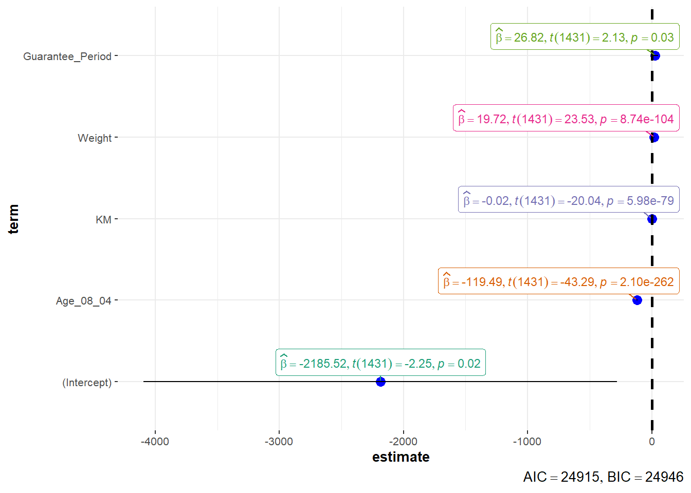 lm(formula = Price ~ Age_08_04 + Mfg_Year + KM + Weight + Guarantee_Period,